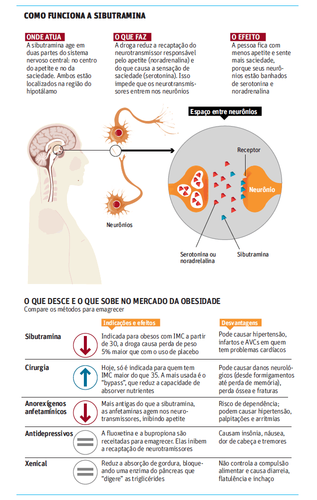 A Anvisa diz que a sibutramina tem baixa eficácia e eleva em 20% o risco cardíaco. O parecer foi embasado no estudo Scout, feito em 16 países, que saiu no “New England Journal of Medicine”.
