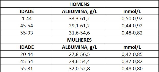 Os intervalos normais para crianças e recém-nascidos são menores do que os encontrados para adultos . Em recém-nascidos é de 29 a 55 g/L (0,44 a 0,83 mmol/L) e em crianças de 38 a 55 g/L( 0,57 a 0,80 mmol/L) .- Tipo de Análise: Quantitativo.- Princípio: A albumina é detectada graças ao fenômeno denominado “erro proteico dos indicadores ” que ocasiona uma mudança na cor de determinados indicadores, na presença de albumina, meio tamponado. O verde de bromocresol reage com a albumina, formando um complexo corado de cor verde, que é medido, fotometricamente.- Amostra: Soro.