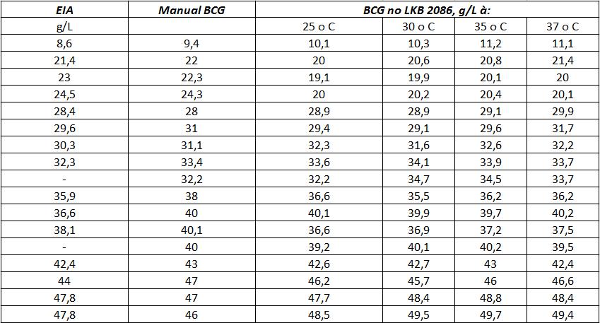 Os resultados obtidos pelo método do BCG não podem ser comparados com métodos mais específicos, onde o tempo de reação é mais prolongado. Isto pode ser demonstrado claramente em em soros que apresentam baixas concentrações de albumina, onde os valores se mostraram falsamente aumentados.