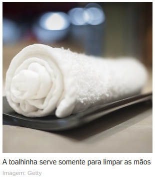 Umedecida com água morna, ela chega enrolada, em cima de um pratinho. E você, que trabalhou o dia inteiro, achou o momento perfeito para dar uma geral na sujeira do rosto, do pescoço, dos braços. Tem um lugar especial para isso chamado banheiro. A toalhinha branca – que também pode ser uma cápsula regada com água quente, que cresce na sua frente – serve só para limpar as mãos. “A mania começou nos balcões de sushi, onde o correto é pegar o bolinho de arroz com peixe com as mãos”, conta Jo. Mas isso é outro capítulo.