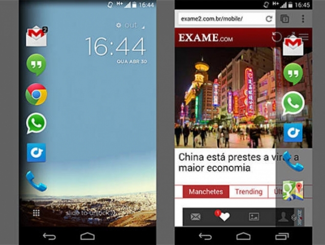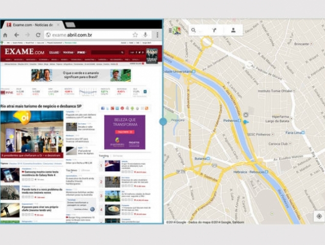 Outra capacidade que alguns gadgets com o sistema Android têm é de dividir a sua tela em diversas tarefas. Na imagem ao lado, foi usado um Galaxy Tab S, da Samsung. A empresa chama o recurso de Multi Window. Ele é uma mão na roda, principalmente em tablets, que o espaço de trabalho é maior. Não é preciso ficar mudando de app para responder a uma mensagem enquanto se navega na internet, por exemplo.