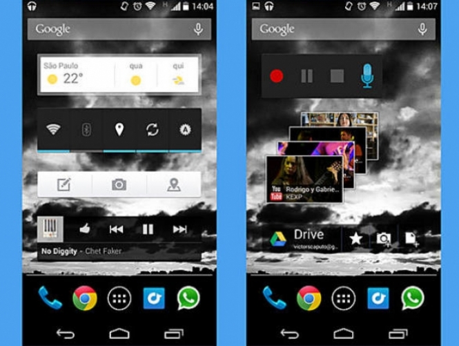 Com widgets padrão do Android, dá para colocar ações simples como ligar Wi-Fi, GPS e Bluetooth na tela inicial. Alguns apps também oferecem seus próprio widgets. Com o Gmail, os últimos e-mails ficam à vista. Com o Facebook, dá para visualizar menções e publicações de seus amigos.