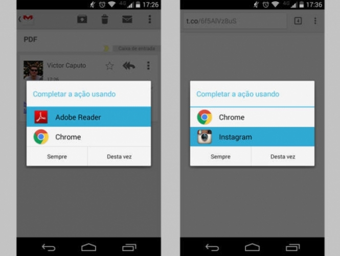 No Android é possível escolher um app padrão para abrir determinado tipo de arquivo. Ao tentar abrir um link de PDF, por exemplo, pode-se escolher entre o Chrome ou qualquer outro app capaz disso, como o Adobe Reader. O usuário pode escolher que o arquivo seja aberto somente uma vez naquele aplicativo ou que o sistema guarde aquela informação e use somente um programa para abrir aquele mesmo tipo de arquivo sempre.