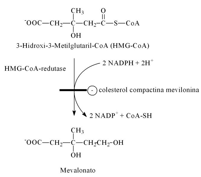A 3-HIDROXI-3-METILGLUTARILCOENZIMA A sofre uma reação de redução, catalisada pela HMG-CoA Redutase, que converte duas coenzimas NADPH + H+ em NADP+, liberando uma CoA-SH e convertendo-se em MEVALONATO