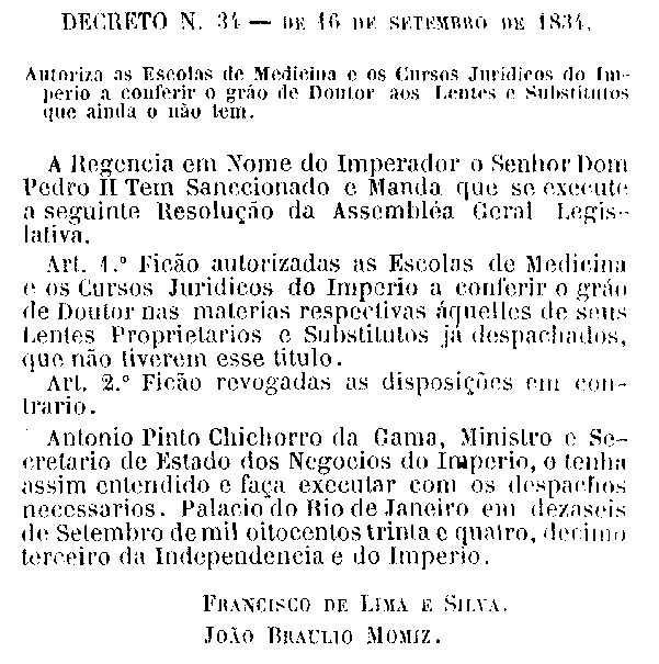 Contando com a colaboração especial da colega Mariana Balby, da Seção de Coleções Especial da Câmara Federal, consegui encontrar a lei e nela se pode ver que fora autorizada a concessão do título de doutor aos então professores titulares (lentes proprietários) e substitutos (auxiliares, assistentes e adjuntos) já despachados (contratados e reconhecidos como tal), das escolas de medicina e direito que não o possuíssem, não trazendo menção alguma de autorização de uso do título a qualquer médico ou advogado que se graduasse daí em diante e que não fosse professor de uma das escolas médicas ou jurídicas do então Império do Brasil.