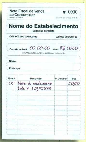 EXIJA SEMPRE A NOTA FISCAL da farmácia ou drogaria. Nela deve constar o nome do medicamento, o número do lote.